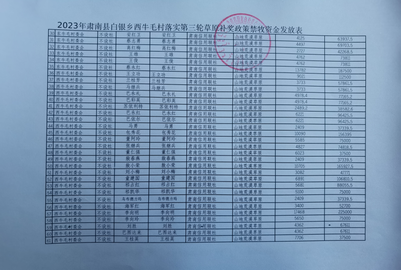 2023年肃南县白银乡落实第三轮草原补奖政策禁牧资金发放表