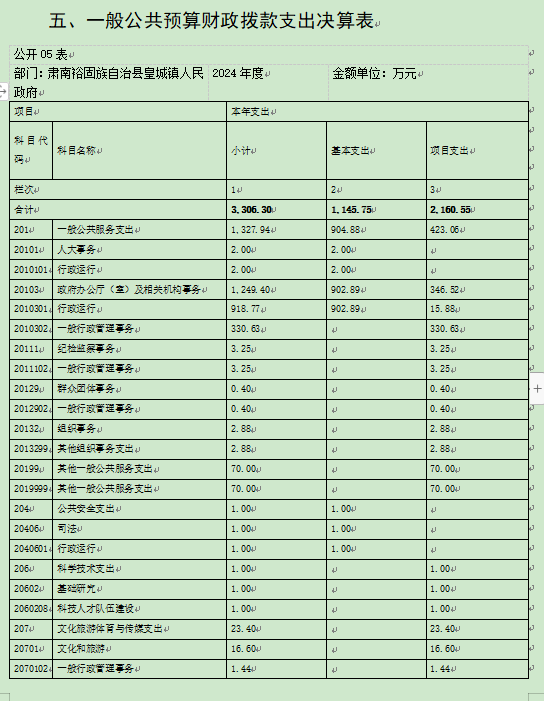 2024年度一般公共预算财政拨款支出3306.30万元,较上年决算数增加961.65万元,增长41.01%。主要原因是2024年度我镇积极开展建设工作,项目支出增加;甘肃皇城抽水蓄能电站项目建设征地移民安置资金数额较大,故一般公共预算财政拨款支出增加。