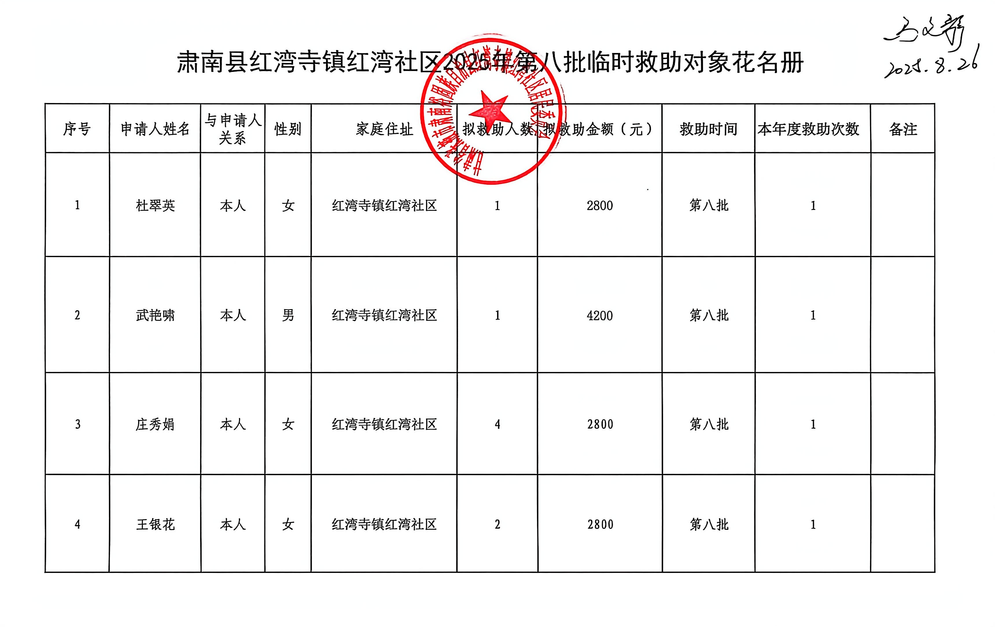 现将肃南县红湾寺镇红湾社区2025年第八批临时救助对象花名册公示如下: