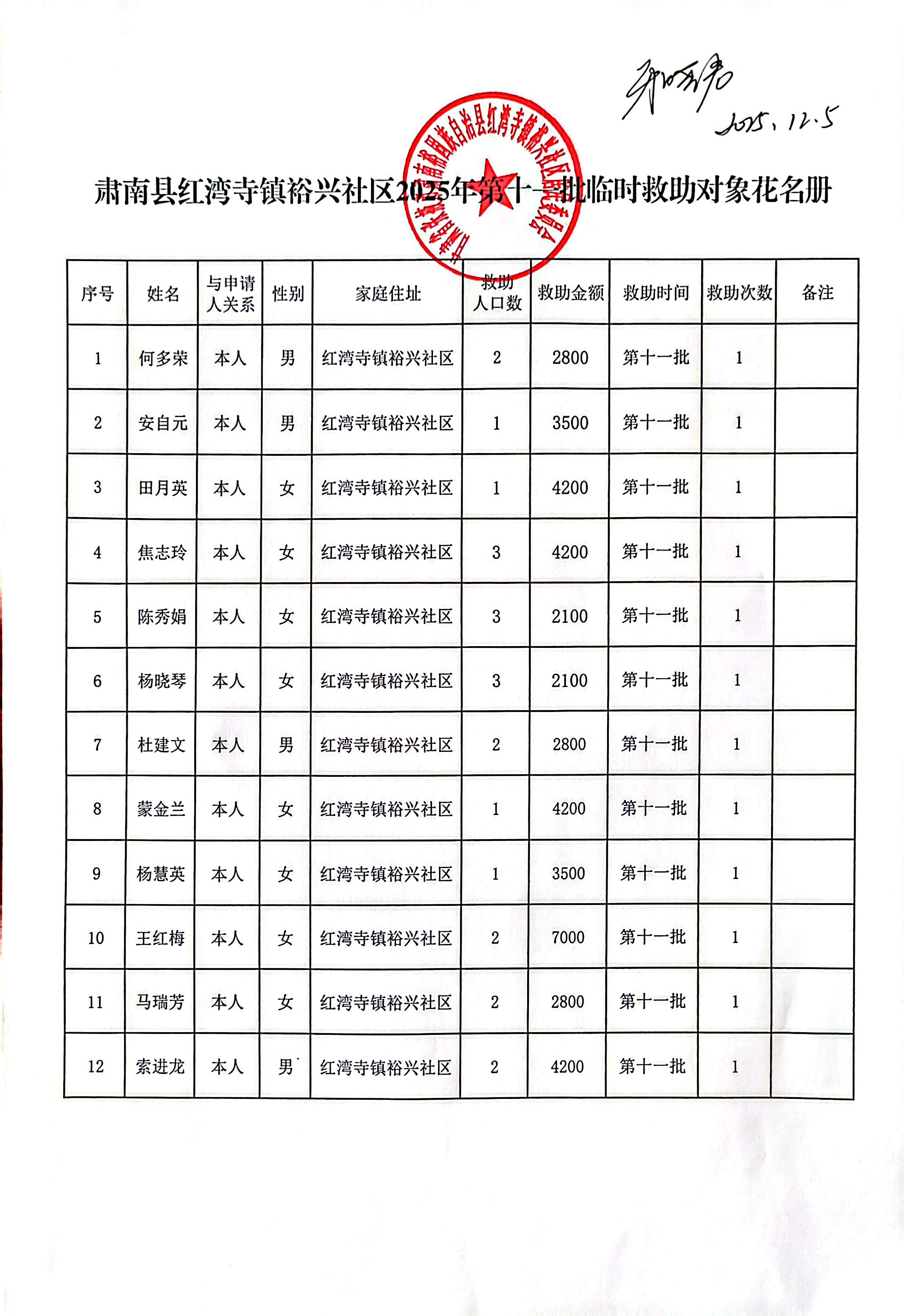 现将肃南县红湾寺镇裕兴社区2025年第十一批临时救助对象花名册公示如下: