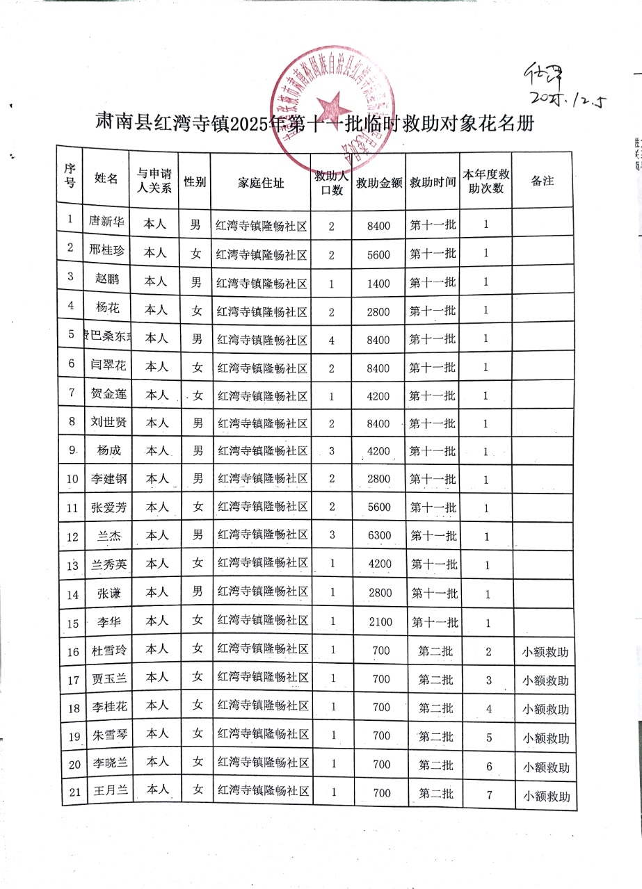 现将《肃南县红湾寺镇隆畅社区2025年第十一批临时救助对象花名册》公开如下: