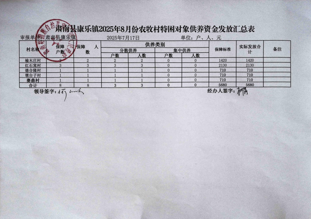 肃南县康乐镇2025年8月份农牧村特困对象供养资金发放汇总表