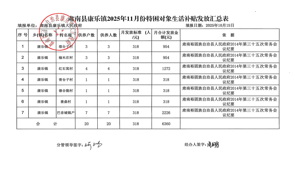 肃南县康乐镇2025年11月份特困对象生活补贴发放汇总表