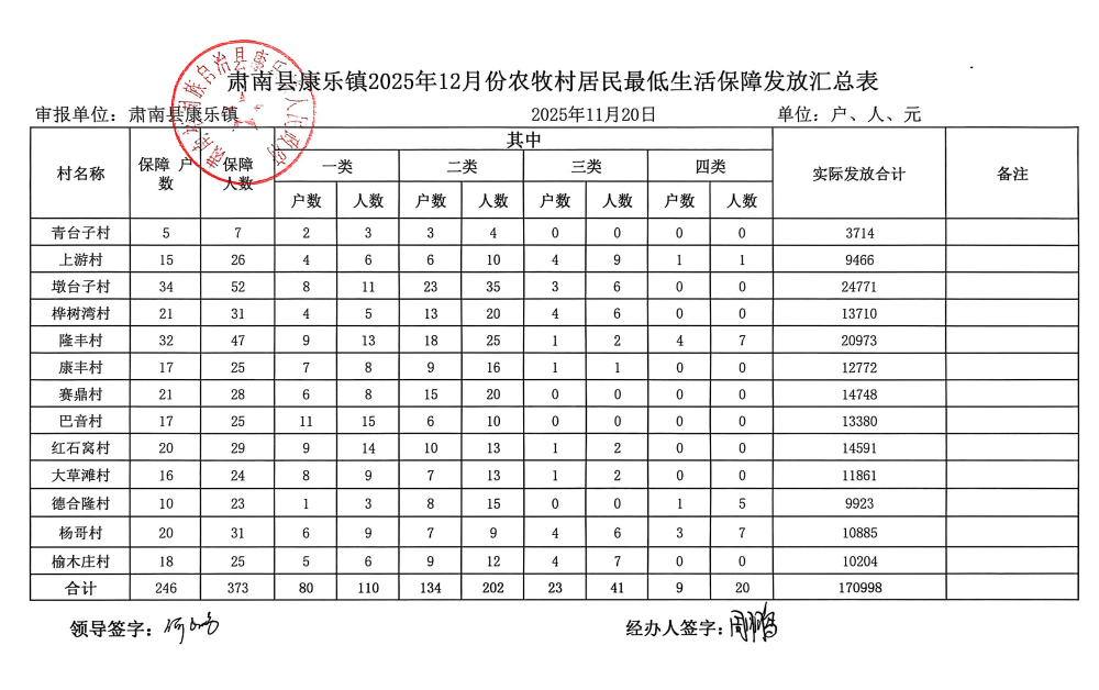 肃南县康乐镇2025年12月份农牧村居民最低生活保障发放汇总表