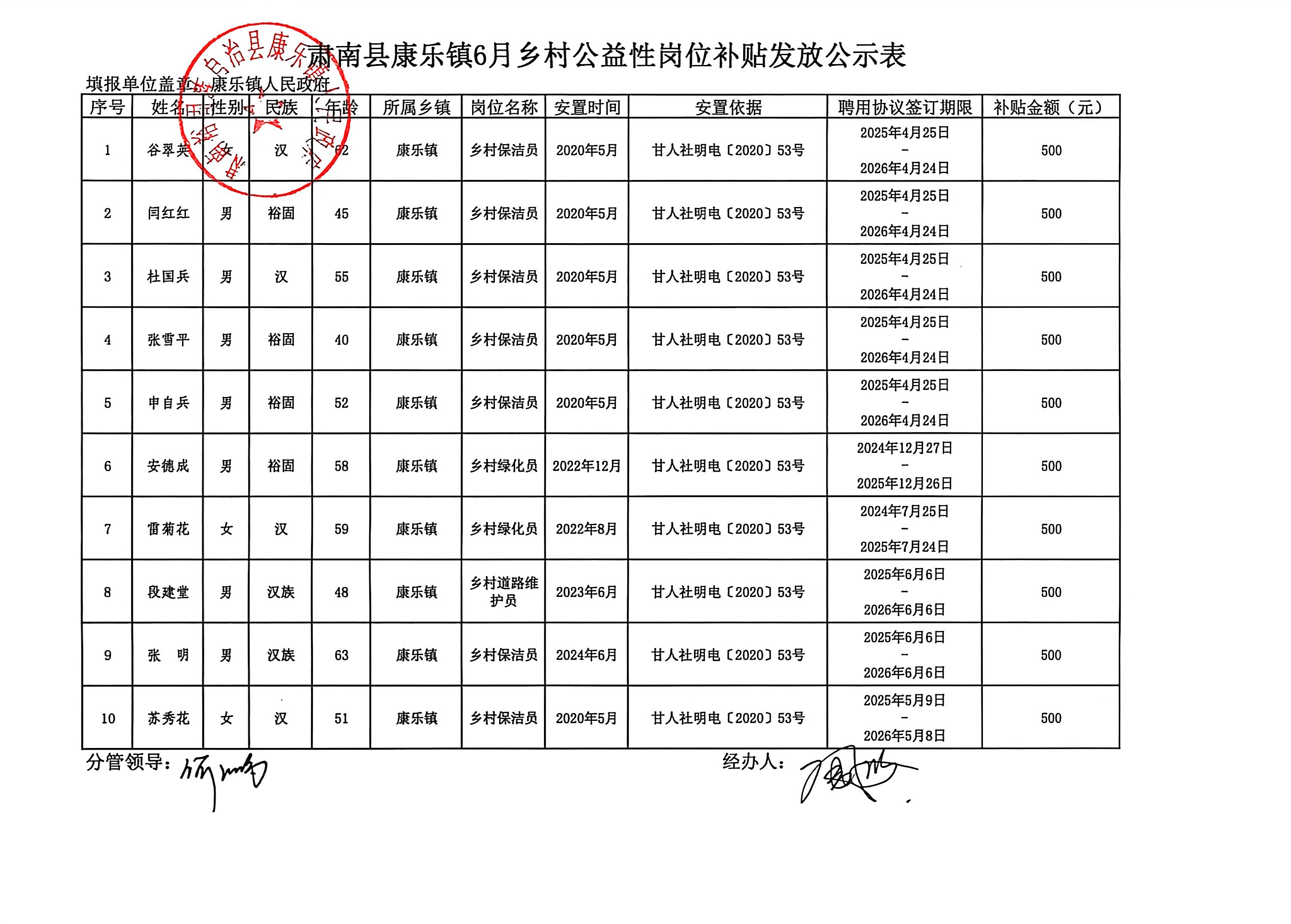 肃南县康乐镇2025年6月乡村公益性岗位补贴发放公示表