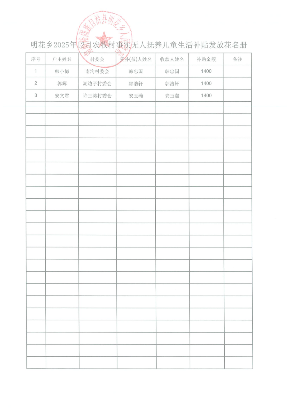 2025年12月农村事实无人抚养儿童生活补贴发放名单