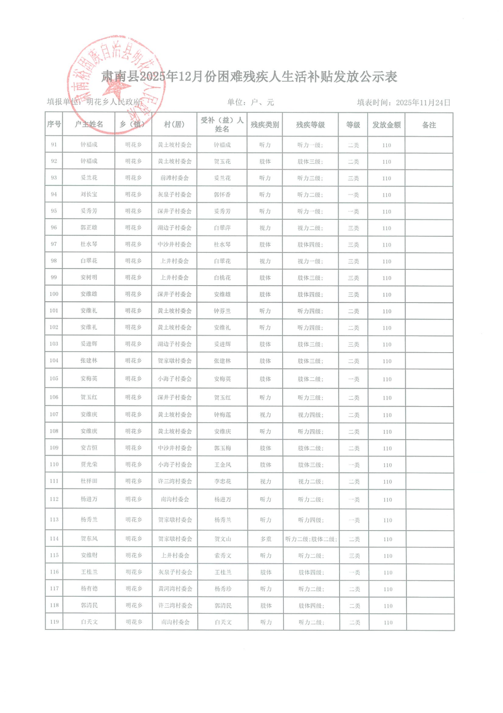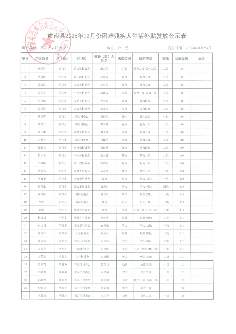 2025年12月困难残疾人生活补贴发放表