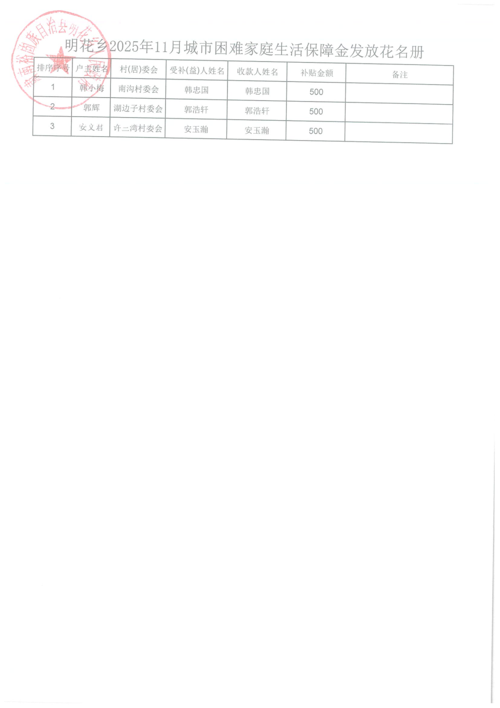 2025年11月城市困难家庭生活保障资金发放表