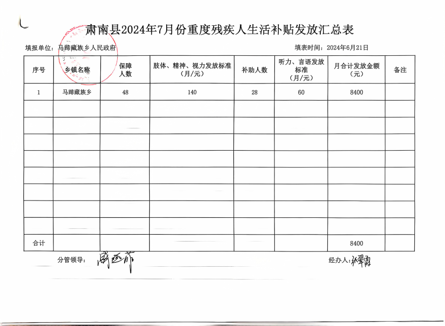 马蹄乡2024年7月重度残疾人补贴资金发放公开