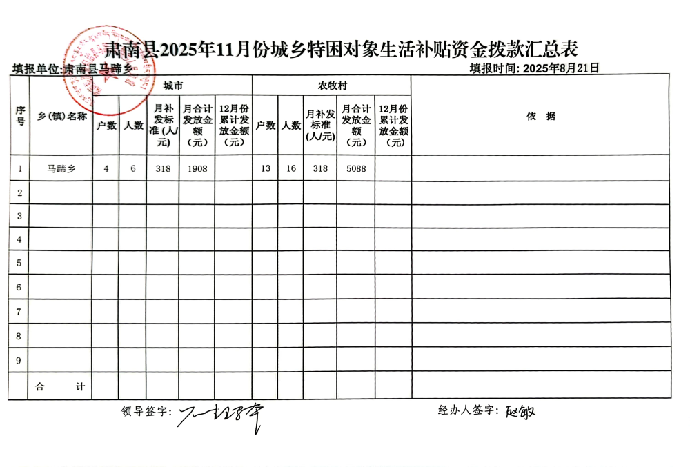 马蹄藏族乡2025年11月份城乡特困对象供养资金发放表