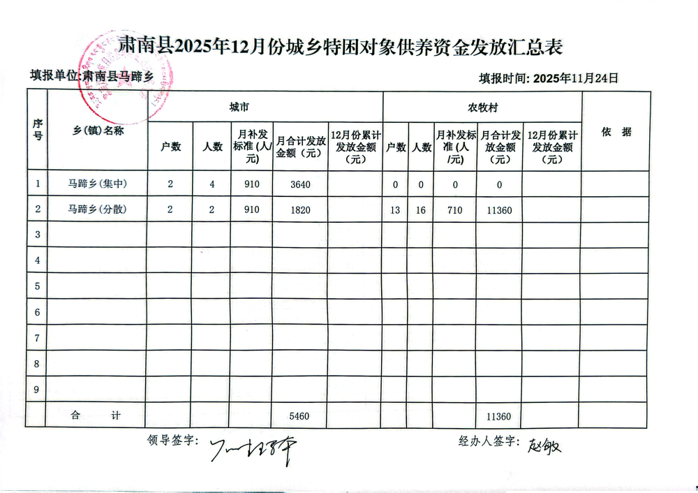 马蹄藏族乡2025年12月城乡特困人员供养资金发放表