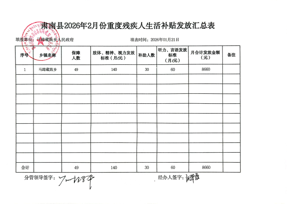 马蹄乡2026年2月重度残疾人补贴资金发放公开