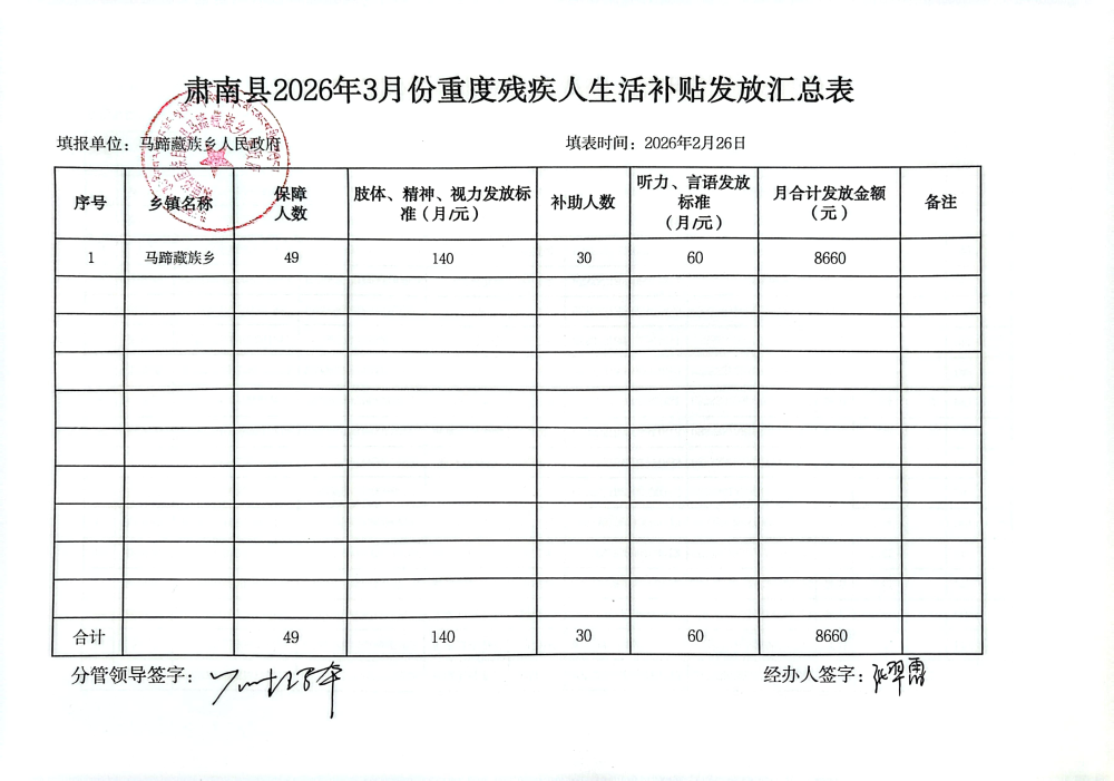 马蹄乡2026年3月重度残疾人补贴资金发放公开