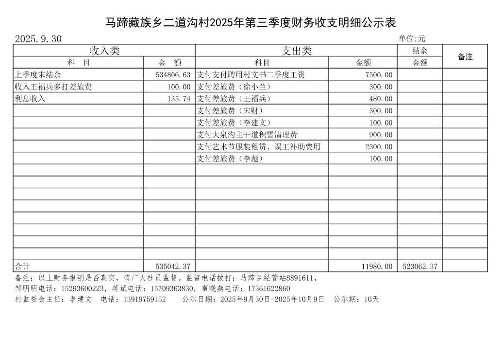 马蹄藏族乡二道沟村2025年第三季度财务收支明细公示表