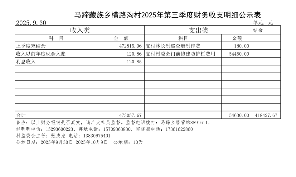 马蹄藏族乡横路沟村2025年第三季度财务收支明细公示表