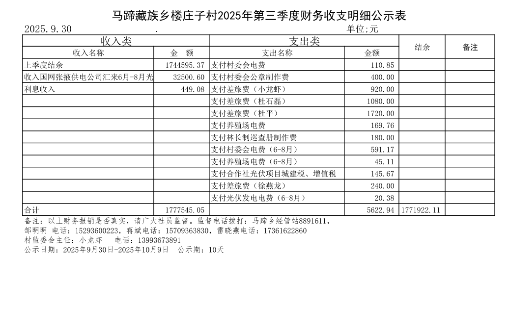 马蹄藏族乡楼庄子村2025年第三季度财务收支明细公示表