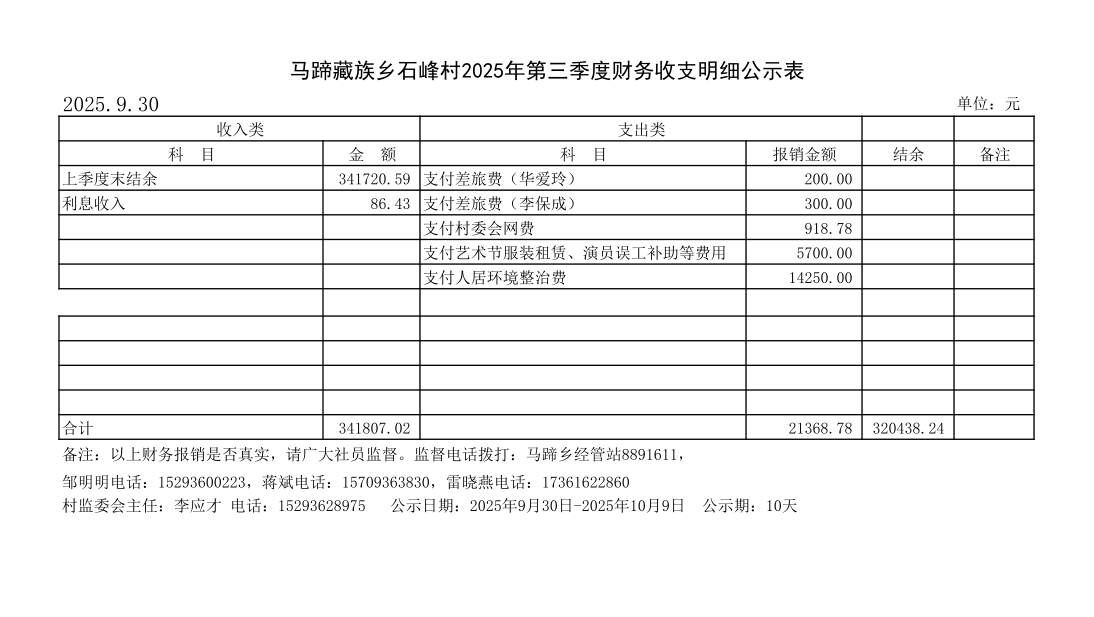 马蹄藏族乡石峰村2025年第三季度财务收支明细公示表