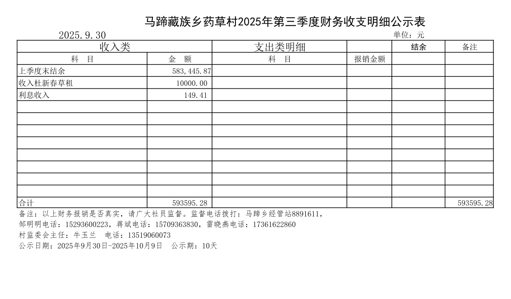 马蹄藏族乡药草村2025年第三季度财务收支明细公示表