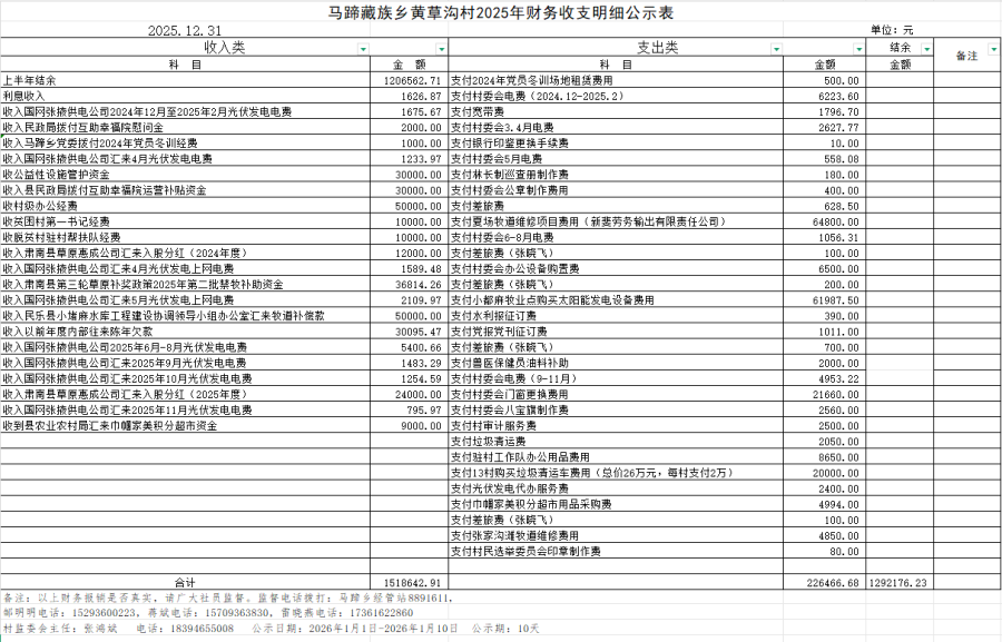 马蹄藏族乡黄草沟村2025年第四季度财务收支明细公示表