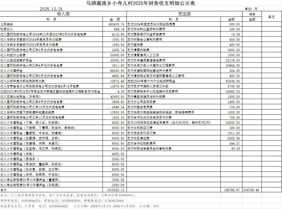 马蹄藏族乡小寺儿村2025年第四季度财务收支明细公示表