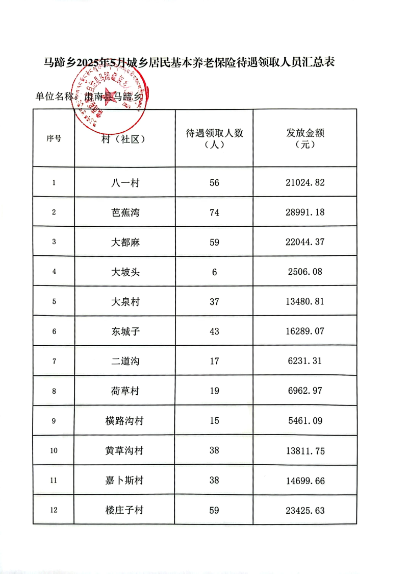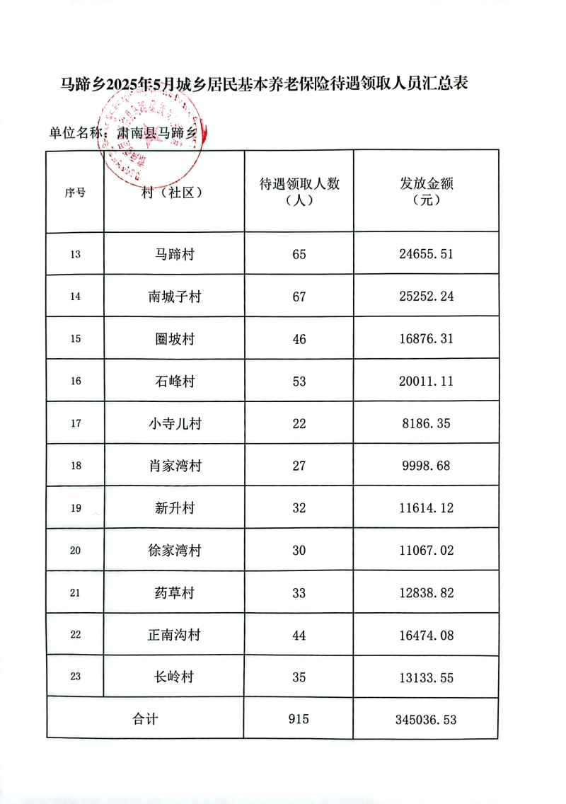 马蹄乡2025年5月城乡居民基本养老保险待遇领取公示
