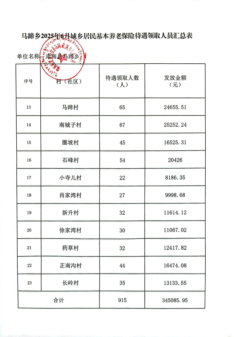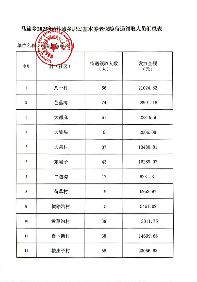 马蹄乡2025年6月城乡居民基本养老保险待遇领取公示
