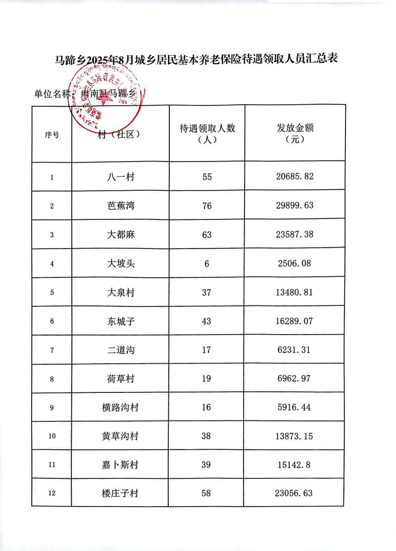 马蹄乡2025年8月城乡居民基本养老保险待遇领取公示