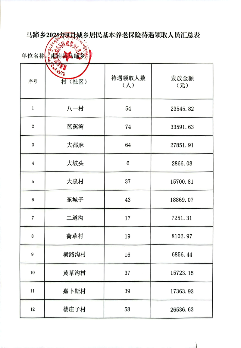 马蹄乡2025年9月城乡居民基本养老保险待遇领取公示