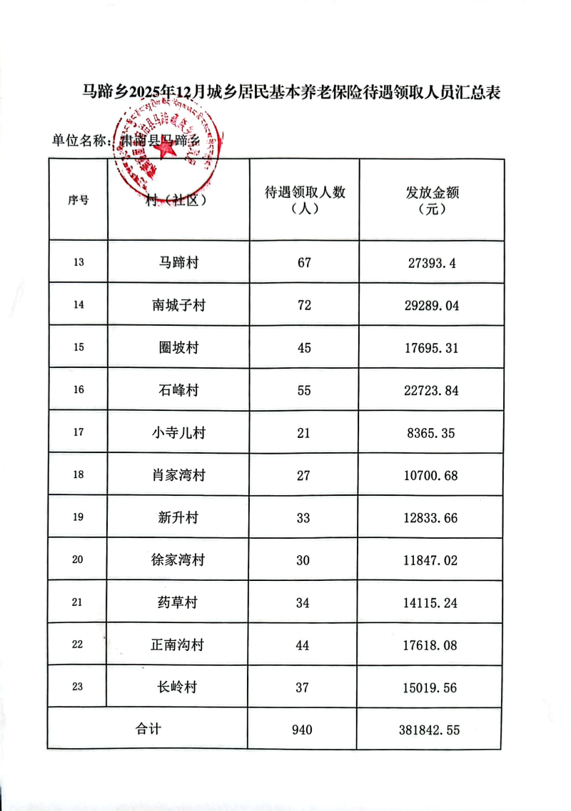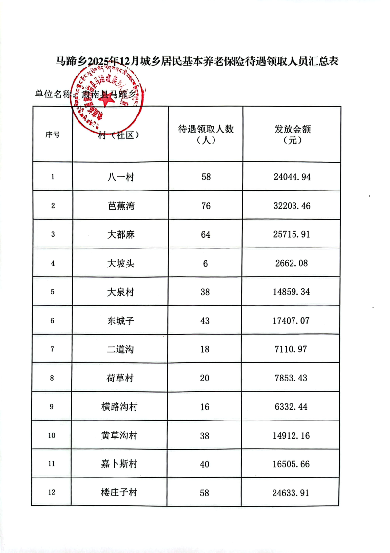 马蹄乡2025年12月城乡居民基本养老保险待遇领取公示