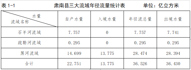 肃南县境内主要河流分布有石羊河、黑河、疏勒河三大水系,总流域面积21462平方公里,涉及主要河流11条,自西向东有讨赖河、洪水坝河、丰乐河、马营河、梨园河、黑河、大都麻河、洪水河、东大河、西大河、西营河等;小河23条 ,主要有红山河、观山河、摆浪河、水关河、大磁窑河、大野口、海潮坝、马蹄河、小都麻河、童子坝河等。全县境内河流的自产水量达22.751亿立方米,入境水量为13.775亿立方米,年径流总量为36.526 亿立方米,出境水量为36.43亿立方米。肃南县三大流域年径流量见表1-1。