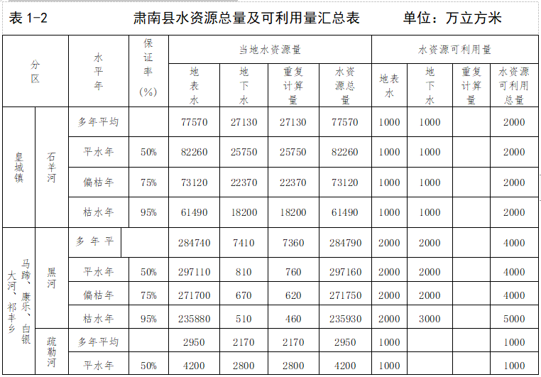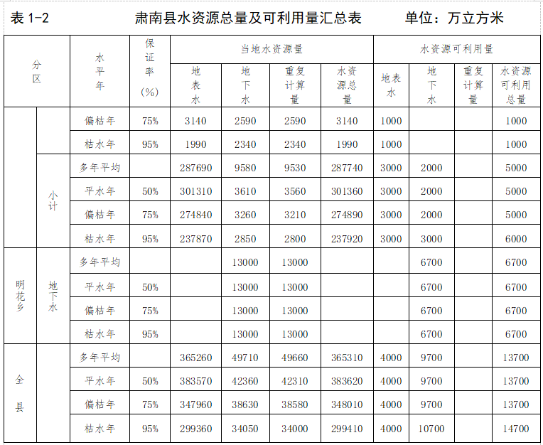 综合上述,全县水资源总量为36.531亿立方米。水资源可利用量为1.37亿立方米。全县水资源总量及可利用量汇总及可利用量汇总表详见表1-2。