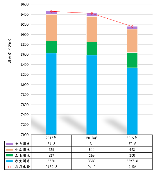 从2017年到2019年,肃南裕固族自治县用水总量均保持在9500万立方米以下,呈逐年下降趋势。但是,不同的行业用水增长趋势不同。近三年来,全县农业用水、生活用水和生态用水水逐年减少,农业用水比例由91.22%下降到91.04%,生活用水比例由5.59%下降到5.06%,生态用水比例由0.68%下降到0.63%;而同期工业用水逐年增加,其占总用水量的比例由2.51%上升到3.28%。这说明我县用水的结构在发生深刻的变化。随着农业节水和生活节水工作的普及和开展,全县农业和生活用水效率在不断提高;随着肃南裕固族自治县工业化进程的不断加快,工业用水需求呈增长趋势,今后全县节水工作重点在于提升工业节水能力和水平,全面提高工业用水效率。