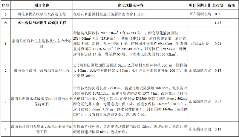 继续实施好黑河流域水土保持与水生态修复建设工程,通过实施水土保持治理、小流域综合治理、生态造林及生态治沙工程,逐步改善肃南县水土流失情况和水生态环境。规划实施生态造林及生态治沙工程1项、小流域综合治理工程1项、水土保持治理工程3项,共计投资1.42亿元: