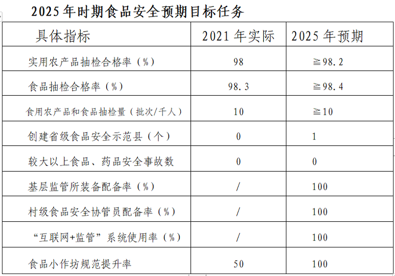 到2025年,建成“制度+科技+责任”的食品安全智慧监管体系,食品安全法律、标准、制度更加健全,党政同责、“四有两责”全面落实到位;食品安全检验检测等科技支撑能力显著增强,食品生产流通消费实现信息化追溯,食用农产品和食品抽检量达到10批次/千人,主要农产品质量安全监测总体合格率稳定在98%以上,食品评价性抽检合格率稳定在99%以上;生产经营者责任意识、诚信意识和管理水平明显提高,经济利益驱动型违法犯罪大幅减少,现代食品产业体系初步形成;基本实现食品领域治理体系和治理能力现代化,市民对食品安全的获得感、满意度显著提升。